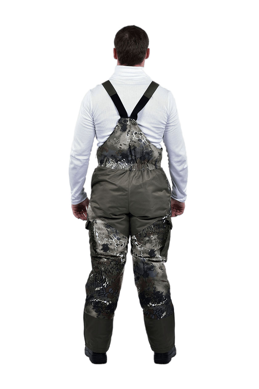➠ Комбинезон: высокий пояс со съемной спинкой, на бретелях. Застежка гульфика на молнию, на поясе — пуговицы. На передней части брюк карманы с отрезным бочком, по боковыми швам в области колена накладные карманы с фигурным клапаном на липучке. Наколенники переходящие в манжеты на резинке, по линии колена кулиса. По низу брюк внутренние манжеты на резинке, со штрипками.
