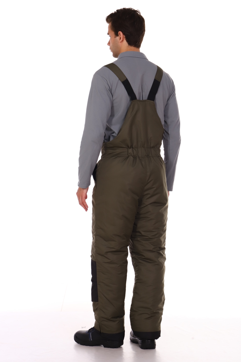 ➠ Полукомбинезон с центральной застежкой на двухзамковую тесьму «молния», с внутренней ветрозащитной планкой, с притачными по линии талии полочками и спинкой. На левой полочке накладной карман с клапаном.. Спинка стянута по линии талии эластичной тесьмой.. Передние половинки с карманами с отрезным бочком, с наколенниками. Внизу боковых швов обработаны разрезы, застегивающиеся на тесьму «молния». По низу полукомбинезона пуфты.